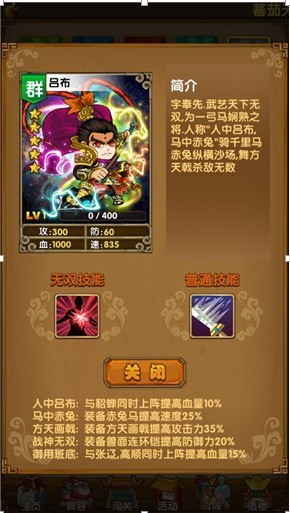 以上是群雄武将的简要分类,不同武将有不同的职能和技能,在战斗中发挥不同作用,武将的获取主要通过商城抽卡、碎片合成、升级礼包、签到活动,换卡活动、副本等,同样的,群雄武将也有着自己的连携搭配,小编以吕布为例,向大家简要介绍连携技能。