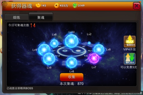 面对不断增长的仙界高手,神器的提升速度也逐渐加快。神器的提升器魂是必不可少的关键,除了装备熔炼获得器魂外,《囧西游》还开放了聚魂系统,在通关31级的副本之后开启,玩家每天有固定次数的聚魂机会,每日可聚魂的次数根据挑战的精英副本进程来决定。换句话说,等级越高,精英副本挑战关卡越多,获得的聚魂次数越多!