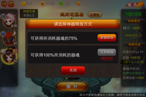 此外,为了保证玩家们的资源得以有效利用,《囧西游》全面开放神器器魂释放功能,玩家换伙伴,神器能完美释放器魂,让玩家们得以享受绝对顶级的装备体验。神器器魂有两种释放方式:普通释放(可获得75%消耗器魂),完美释放(消耗元宝可获得100% 获得消耗器魂)。只有伙伴能够释放器魂,在点击伙伴神器“释放”后,可获得所消耗的器魂。