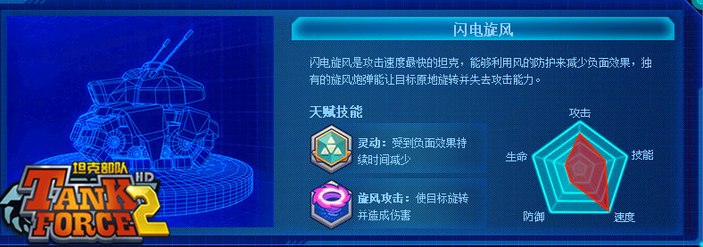 闪电的速度、风的灵动,闪电旋风是《坦克部队2》中飘逸的精灵。它不仅能够利用风的防护来减少负面效果,独有的旋风炮弹还能让目标原地旋转并失去攻击能力。3D模型中两根俏皮的天线是最大亮点,不难想象战斗中闪电旋风上窜下跳、玩弄敌人的情景。