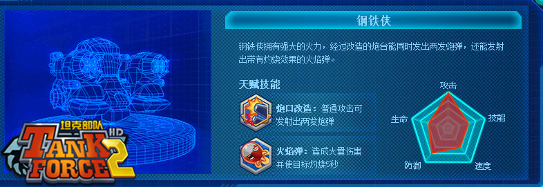 《坦克部队2》中,钢铁侠是土豪级别的主角,经过改造的炮口使他普通攻击就能发射两发炮弹攻击敌人,还能发射火焰弹在造成大量伤害的同时灼烧敌人。3D模型中,钢铁侠头部高度还原了电影中的形象,不过最引人注目的还是两架威猛的炮口。