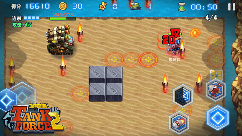 《坦克部队2》在原作的基础上重新设计了场景地图,不仅扩大地图范围、新增更多场景,还对每个场景进行了细致雕琢,丛林、沙漠、城市等等众多场景各具特色。另外,场景中的众多元素极具趣味性,会“下炸弹”的小兵、固定不动的炮台、发射强力激光的激光发射器等等,趣味元素众多,每一个关卡都独一无二,闯关当然更加好玩!