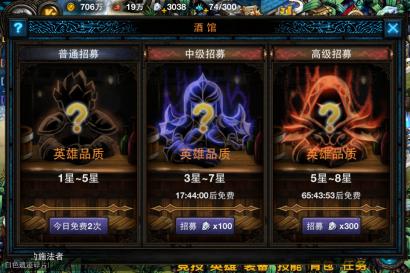 每个玩家领地里都会有一座酒馆,点击进入酒馆以后就可以招募英雄进行战斗。招募英雄分为三个档位。招募的档位越高,获取传奇英雄的可能越大,换来的是英雄品级越高,更有可能刷出极为稀有的“霸”品质的传说级英雄。