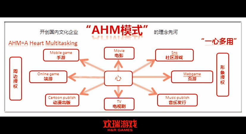 “AHM模式”,即“A Heart Multitsking”,对应"一心多用"。欢瑞游戏认为,一个优秀的IP等同于一个关键的核心,不仅可以为电影、电视、游戏、音乐、动漫、文学、周边创意等其他娱乐产品提供创意版权,还可为传统娱乐产业提供受众,并能在各模块之间形成联系,快速完成原始用户的积累及影响扩张。同样,网游、影视及其他模块要形成真正的互补及互动,多方必须保持高度统一。对影视拍摄和游戏研发周期进行强有力的协调和控制,自项目立项开始,审核双方市场与用户的匹配度,而后对美术风格、剧情、素材、资源、音乐等进行统一,将优秀的原始内容向多样化领域扩张衍生,直至达成电影与网游完美融合。欢瑞游戏的目标即为用户打造全方位的立体新娱乐体验。