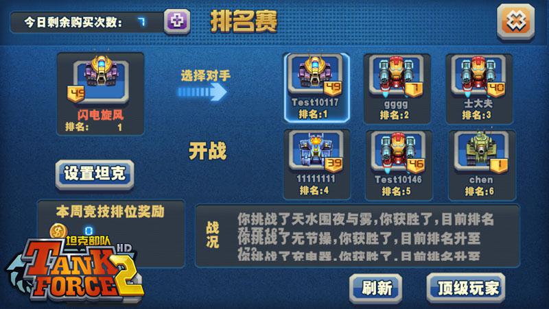 配备了超强配件,升级了顺手技能,打造出的最强坦克不晒一晒怎么行?《坦克部队2》新推出的排位竞技系统,充分满足你的成就感!在排位赛中,玩家能够看到其他玩家的坦克等级,看着哪个坦克不顺眼,果断挑战它,比比谁的坦克更加强大。除了能抢占排名,受到全服玩家瞩目,还能在每周获得排名奖励,排名越前,奖励越丰厚!