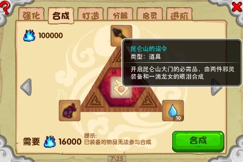 既然藏宝丰富,那么神秘的昆仑山也不是随便能进的,进入昆仑山需要获得“昆仑山的诏令”,道具可在炼丹炉中通过两件邪灵装备及一滴龙女的眼泪合成,另外,昆仑山中是有复活次数限制的,所以精湛的技巧与强力的装备才是夺回昆仑山并获得魂器的关键!