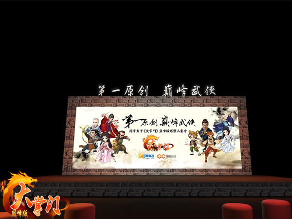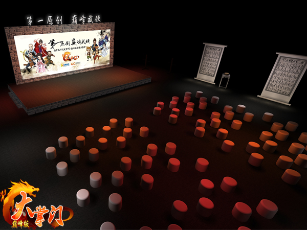 步入会场,四周挂满了各种武侠卷轴,台下木桩式座椅星散分布,主看台上是大大的游戏海报,“第一原创、巅峰武侠”几个字眼异常醒目,不久,在这里就将上演一场巅峰武侠碰撞,让我们拭目以待吧!