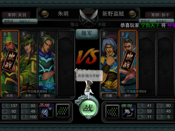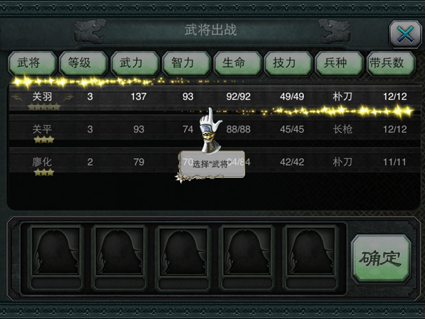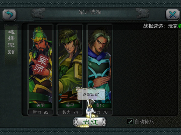 进入游戏,选择好自己的名字之后,玩家会进入一段很简单的战斗教程,基础战斗流程很简单,首先需要选择出征的武将,一次性最多可以选择5个武将出征,然后选择出征的军师,武将和军师都决定了战斗中可以使用的技能,军师技一般会在战斗前自动施放,主要以增益性BUFF为主,武将技则是在战斗中施放的攻击性技能,随着武将等级的提升,武将可以学习越来越多的武将技。