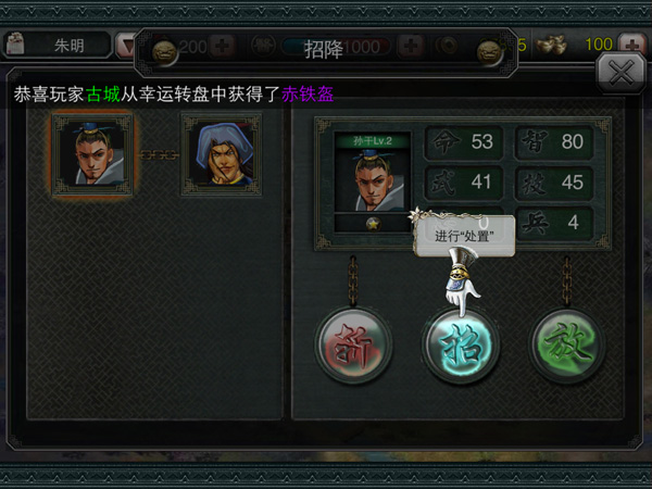 每次战斗结束之后,玩家都会获得一定的道具和金钱奖励,除此之外,在攻下部分城池之后将会有机会抓捕到一些武将,并会有“斩首”,“释放”,“招降三个选项,斩首之后的武将不会再次出现,释放后的武将会出现在接下来的地图中,而招降则会有几率招募到一些高级的武将,想要壮大自己的实力,招降一些极品武将可是必不可少的。