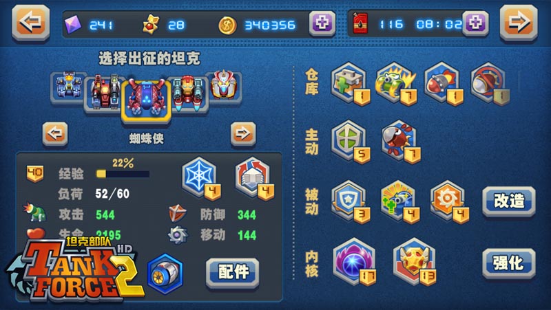 全新的坦克部队由10种坦克英雄组成,蜘蛛侠、钢铁侠等动漫英雄尽在其中,超人会飞、蜘蛛侠能发射蛛网弹,每种坦克都有自己的特色。除此之外,《坦克部队2》创新推出坦克改造模式,玩家可以为坦克添加炮筒等配件,还能为坦克配备火箭弹、修复箱等各种技能,把自己最喜欢的坦克主角,打造成最个性最强大的坦克英雄!