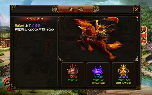 《侠客传OL》强大的帮派功能,有养成类的“阵法”能提高你角色的初始攻防,有持续性极高的“祈福”和“祭坛”每天都能获得招收高阶武将所需要的声望值,有充满惊喜的“福利”让你每天都能抽取各种材料、道具。