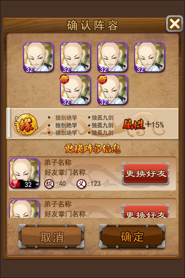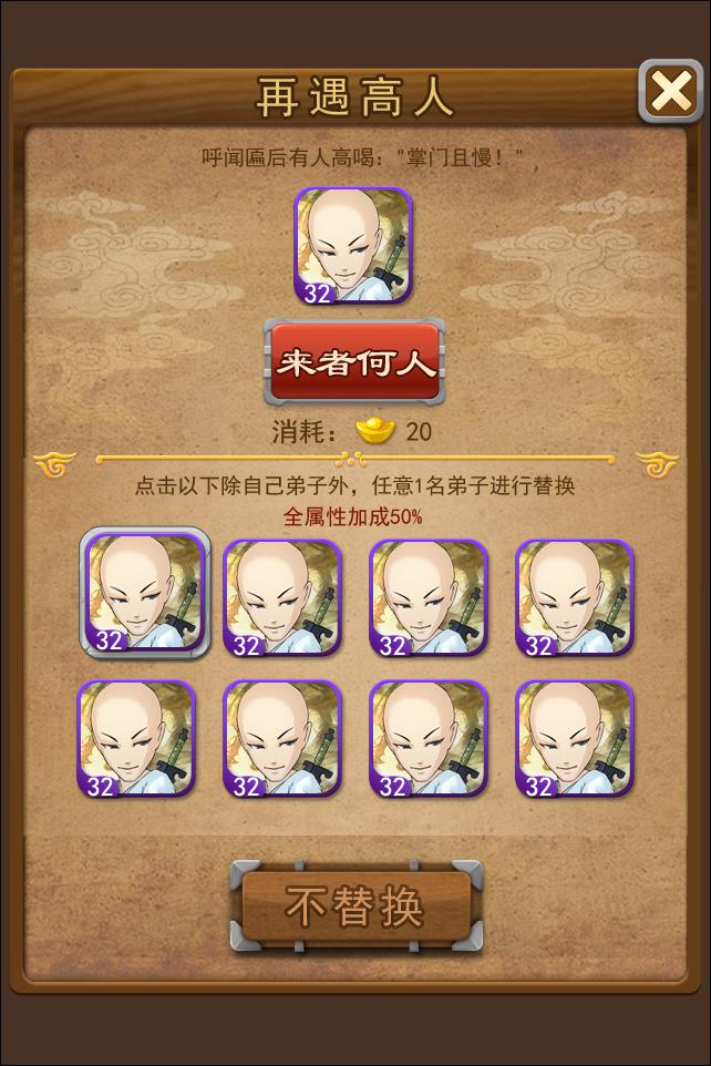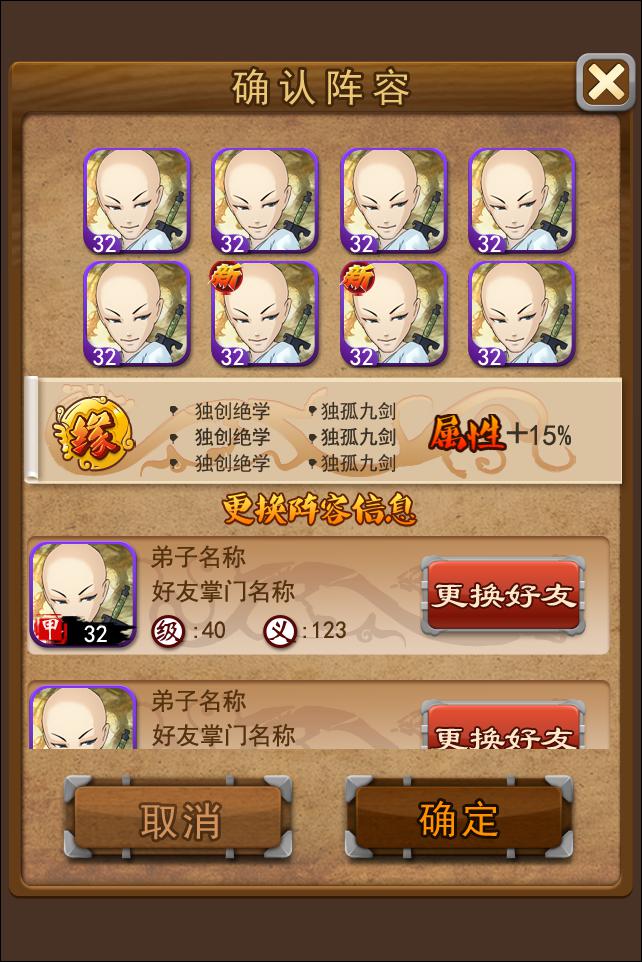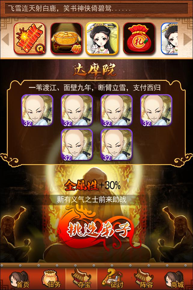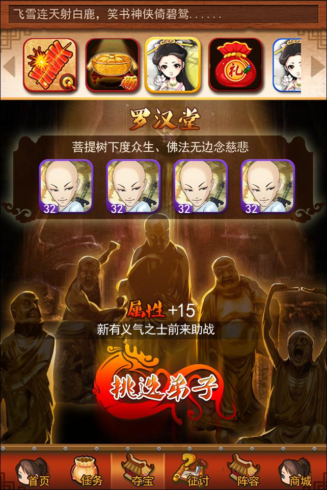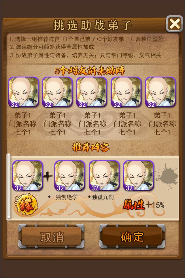 江湖人士最重义气,共闯少林前好友携门下弟子前来助阵,玩家每使用好友弟子1次,双方的义气值+1,不同的“义气”等级可在共闯少林时获得不同的弟子等级加成,再也不用一个人游戏,基友、兄弟一起战。