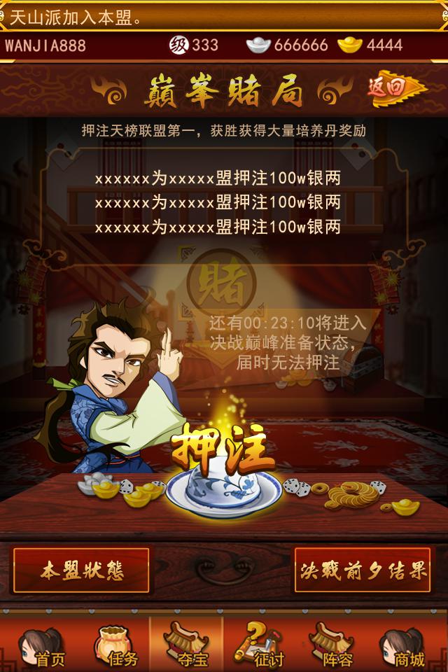 紫禁之巅决赛前,参赛玩家可押宝竞猜第一联盟的归属,一旦押宝成功将获得大量的游戏银两奖励。