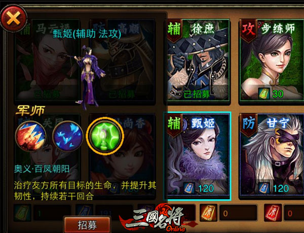 把曹家三父子迷得神魂颠倒的洛水之神甄宓,宛如九天神女一样超凡脱俗的仙子。她是不是你心中的三国女神呢?要把她收归靡下,成为战团里的一员,并不是什么困难的事。只要1小时就能冲至25级这时候就能轻松招募。她的大招“百凤朝阳”,能治疗友方所有目标的生命呢。