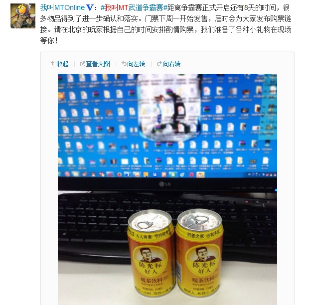 被媒体誉为“中国首善”的江苏黄埔投资有限公司总裁陈光标最近又有了新动向。据卓越游戏官方微博透露,陈光标旗下的饮料品牌“陈光标好人暖茶”将成为卓越游戏《我叫MT online》天下第一武道争霸赛现场的特供饮料,玩家可免费品尝。除了饮品外,陈光标还赞助了山地车、路由器等多种礼品。据悉,手游行业的首场电竞职业赛《我叫MT online》天下第一武道争霸赛将于10月27日正式举办,现场将有千名手机游戏玩家参与本次活动。