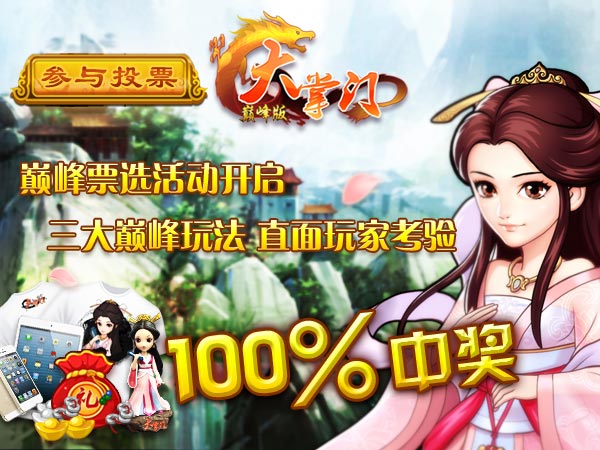 江湖快报,第一武侠《大掌门》(玩蟹科技出品)巅峰版今日正式上线,新版本巅峰玩法将直面玩家的考验。与此同时,官方精心策划了诸多给力活动回馈广大玩家,凡参与活动者均有机会获得iphone5S、iPad Mini、海量元宝、四大美女魂魄、武林至宝纯阳铁盒、神秘陨铁(可以合成神兵玄铁重剑)、王语嫣手办等诸多大礼。另24日官网微博活动时,还将有神秘金庸影视明星现身广发邀请码邀请各位掌门一起游戏,良机不可错过,各位掌门赶紧行动起来!