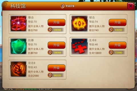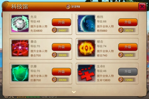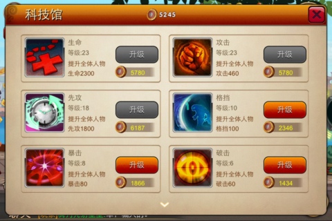 格挡、暴击、破击、抗暴:这四个属性都是后期升级的重点,这四个科技有两种升级法:一是根据你的队伍特定选择一两个主要提升,例如攻击型的主要升级暴击和破击,防御型的主要升级格挡和抗暴。二是平衡发展平衡升级,每个属相均衡升级,阅历是永远不够用的,没必要拘泥于某一属性。