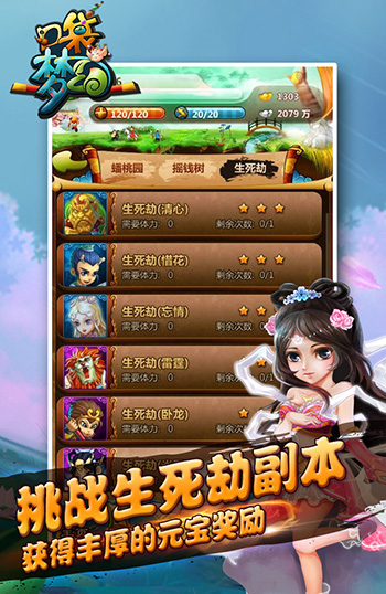 《口袋梦幻》的活动副本每天都可以打,其中的奖励几乎涵盖了元宝以外的日常所有硬性需求。比如我们要给卡牌升级,可以到蟠桃园中打千年蟠桃和万年蟠桃;我们需要银两,可以去打摇钱树的钱箱;需要升级卡牌的技能,可以到门派战中打技能卡;需要提升自己账号等级时,可以去打修炼台。光是以上这些实用奖励就没有不打的理由了,而活动副本还有更吸引人的地方。