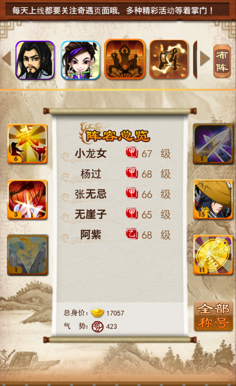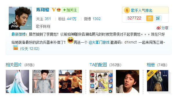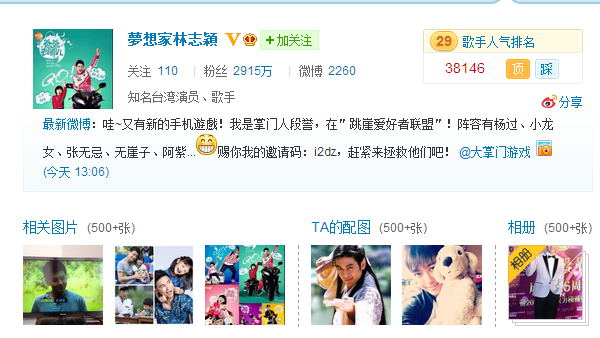 永远一张娃娃脸的林志颖还是那样的活泼,这位阳光大男孩最近他迷上了《大掌门》。林志颖平时工作繁忙,但玩起游戏来一点也不含糊,一手杨过、小龙女、张无忌、无崖子、阿紫、萧远山的弟子阵容可谓强悍,相信一定花了不少的时间收集。林志颖在游戏中一向低调,然喜爱搞怪的他觉得一个人游戏太过寂寞,最近正四处散播自己的邀请码希望邀请粉丝们跟他一起玩《大掌门》,众粉丝们可准备好啦?