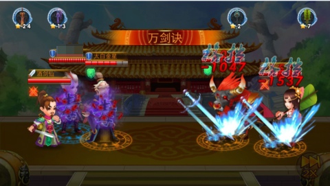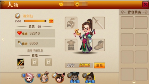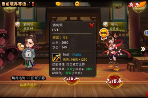 酒剑仙境界达到22级可招募,必杀绝技“万字决”,对战时打击对方全体,一次打三,这可是众多囧友们孜孜不倦追求的高境界啊,有了这个超级小伙伴就可以轻松做到。此外,升攻、封印、撕裂三大附加技能集于一身,超级伙伴,舍我取谁!