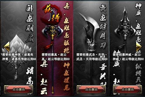 武将神器,顾名思义,武将与神器是密不可分的。每位资质非凡的武将都会有一柄宿命中的神器与之辉映。当你将这些武将招募至麾下,只要其登堂入室达到60级,你就能激活专属于他的那一柄神器。