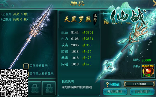 《仙战》中的神兵与法宝有一定程度的相似之处,它的存在意义是给角色增加属性和战斗力,同时拥有其专属技能。另外,神兵也和法宝一样可以进阶,随着进阶等级的提升,附加属性会越来越高,技能也会越来越强悍。