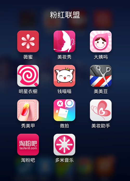 智能手机诞生之初,还是男性用户的玩物。它被用于提高效率,游戏娱乐。如今智能手机广泛普及,越来越多女性用户加入其中,她们更加感性,爱美、爱生活、爱购物、爱时尚、极大地拉动了偏向于“粉色系”应用的需求。据小米应用商店的统计表明,这些专门为女性设计的软件,均不约而同地采用粉色系界面、图标设计,这正是“粉红联盟”称号的来源。