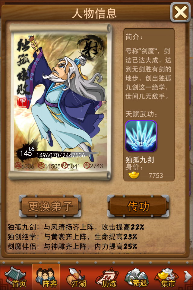 各位掌门都知道衡量一个弟子的强弱主要就是看其属性,独孤求败成长属性极高奠定了其最强弟子的地位。再看他的甲级武功独孤九剑,本身触发 几率就很高,配合其高攻高内的属性特点,输出上绝对是恐怖的存在,杀人如切菜。此外,独孤求败的配缘几乎都是加高攻的效果,总之一句话,“独孤一出,谁与争锋”,杀人越货必备弟子,大家都爱他。