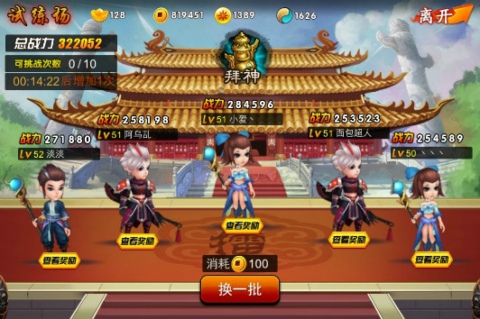 试炼场每天默认可以挑战10次试炼场内的玩家,每批5个玩家,换批需要消耗100铜钱。10次挑战机会用完后,每1小时增加1次挑战机会;如果增加达到10次后将不会增加,不要忘记随时去试炼场PK下哦!玩家只要点击想要PK的对象就能立即进入战斗状态。获胜者将获得大量的功力和境界点,而失败者奖励减半。功力和境界在游戏中都是是必不可缺的,境界的提升可以让玩家招募到更强力的伙伴,功力则可以提升技能等级。