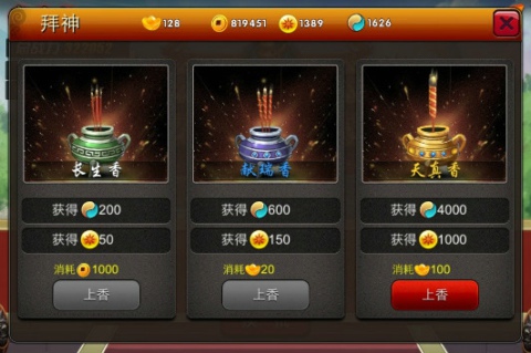 试炼场可以“拜神”获得境界及功力,拜神分为3个级别,分别为“长生香”(消耗1000铜钱获得200功力50境界)、“献瑞香”(消耗20元宝获得600功力、150境界)、“天真香”(消耗100元宝获得4000功力1000境界)。