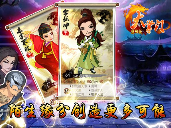 《大掌门》是由玩蟹科技出品,玩蟹、蜂巢联合运营的集武侠、策略、角色扮演为一体的武侠类手机网络游戏,游戏中玩家将化身一代掌门,掌控群侠一起闯江湖、访奇遇、论剑华山。最终打败各大门派立于武林之巅,从此称霸天下。