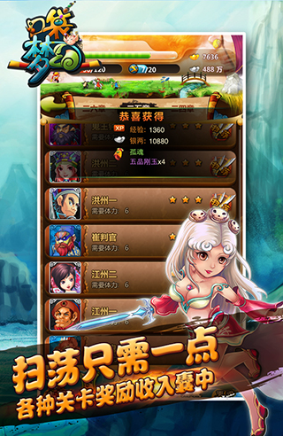 新加入的扫荡是非常便利的功能。当玩家们满星通过一关,想刷卡牌或者刷素材时,不需要再看战斗画面,只需在扫荡按钮上轻轻一点,可获得的经验、银两、素材、卡牌全都呈现在你面前。更难得的是,扫荡所需的体力和正常打关一样,获得的奖励丝毫没有打折,并且没有冷却时间。扫荡为玩家们节省了很多时间,无论是在车上还是办公室,刷素材刷卡牌变得更加轻松便捷。
