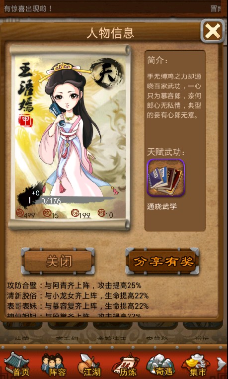 王语嫣在《大掌门》中是一个各项属性都十分平庸的弟子,不过你可千万不要小瞧这位手无缚鸡之力的妹子哦,王语嫣的天赋技“通晓武学”能给敌方弟子阵容全体减防,战斗BUG的存在,极其稀有,掌门们一旦发现可千万要抢到手哦!