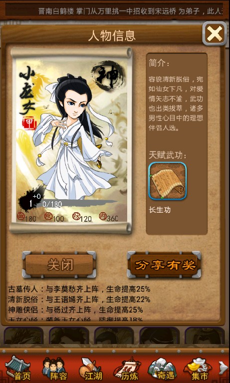 容貌清新脱俗,宛如仙女下凡,对爱情矢志不渝......爱上小龙女的理由有很多,作为甲级弟子小龙女的防御成长十分的突出,其天赋武功“长生功”增加闪避,由此造就了小龙女超高的生存能力。不过,就配缘而言小龙女的配缘多是丙级缘分,以加血为主,输出能力有限。
