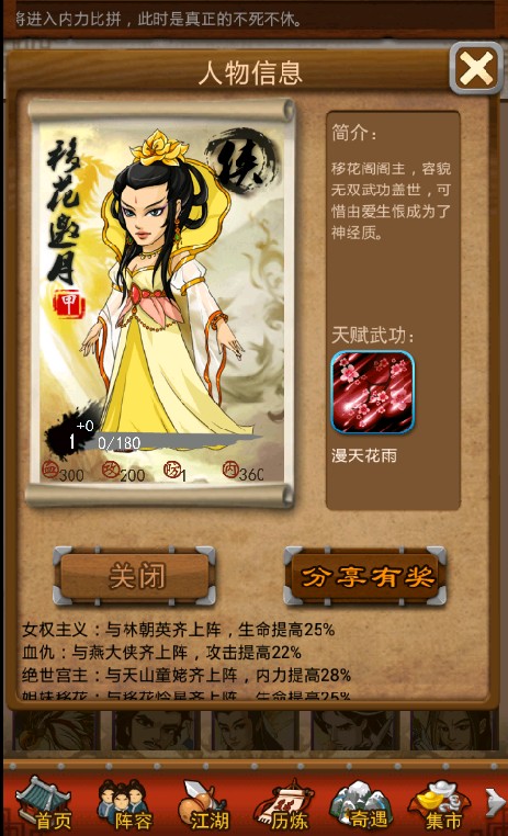 移花宫宫主,容貌能与日月争辉,气质出尘,性格冷若冰霜。在《大掌门》中邀月的血防成长不高,但攻击力成长仅次于东方不败,一击必杀是邀月的根本所在,邀月培养因主攻击,如若能配以攻击型心法,其输出将十分变态。