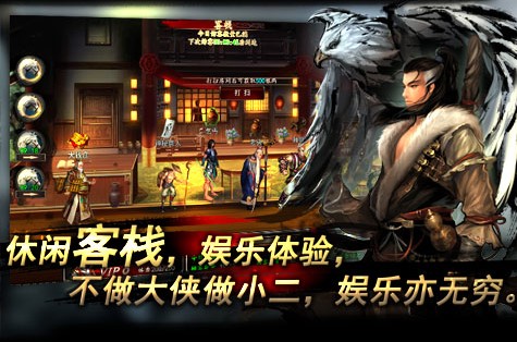 在进行一连串的刺激闯关后,玩家能移驾到客栈系统中通过各种休闲玩法来赚取银两,玩法类似经营养成游戏,玩家还可对客栈进行升级,每次招待了客人后,会获取经验值,经验值达到上限后,客栈掌柜将会出现,玩家可点击掌柜NPC进行提升客栈的等级。不做大侠做小二,天天守着客栈招待顾客也能赚得金满盆,娱乐亦无穷。