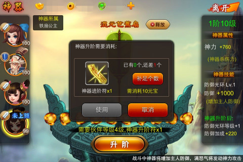 伙伴们想变强,神器可不能忽视!神器的提升需要消耗一定的器魂数量,当前神器级数达到10级后,需要使用神器进阶符以提高神器的阶数后,才能继续升级。神器进阶符在副本中随机掉落,如果没有神器进阶符,要想提升神器的阶数就成了一项不可能完成的任务咯!