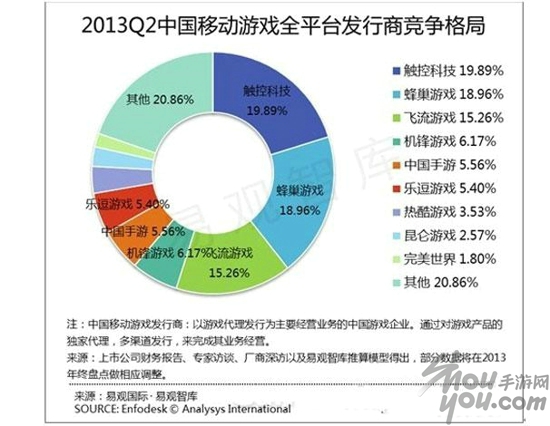 风生水起的手游发行市场正越来越受到大家的关注,在自研的基础上代理其他公司的精品产品,使得外来血液的不断补充,增加公司的产品线,降低风险,并从而树立强势的游戏品牌,成为了目前手游圈大玩家们的一致观点。目前份额上领先的公司,也未必就能稳坐一线的位置,除了在继续争夺投把交椅之外,也需要进一步巩固自己的地位。除了上述4家份额领先的移动游戏发行商之外,排名居于其次的蜂巢、乐逗、掌趣、热酷等等也都是颇具实力的竞争者,目前它们虽然在份额上同第一梯队的发行商们还有一定的差距,但它们也在暗暗蓄力,以求反超。实际上对于格局尚未确定的手游发行市场而言,存在着无数的可能,相信在2013年末,值得期待的还有很多。
