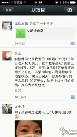日前,陈昊芝在他的微信朋友圈中分享到,“触控韩国公司代理的《秦姬》11月1日当日收入10万美元,这个数字是从1周前上线的4万、5万、直到10月底的7万当天逐步增长上来的,非活动峰值。海外持续推动是核心。10月份另外一款海外发行的产品单月是100万美金,这时上线次月的成绩。真心为团队骄傲”。从陈昊芝的言语中,除了看出他对公司和团队的自豪之外,也能看到触控已经在海外游戏市场收获了一定成绩。手游网认为,在今年Q4,触控科技将是最有实力和中国手游一较高下、争夺发行商Top1的选手。