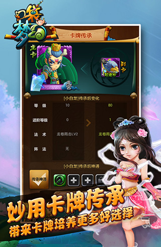 传承可以将紫卡或蓝卡的卡牌等级、进阶等级、神通、阵法等能力传给另一张同品质卡牌。并且传承从游戏开始时就可以使用,对于新玩家是一个非常便利的功能。当你初期没有抽到如愿的卡牌,但为了闯关顺利,不得不进行培养,这样的卡牌随着游戏进度可能会作为进阶素材,也可能会坐冷板凳。