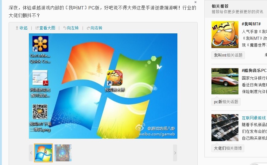 该消息可行度比较高,其中一张截图是WIN7的界面,显示安装后的软件为《我叫哀木涕》PC版,另一张图则为游戏在电脑上打开的登陆界面。