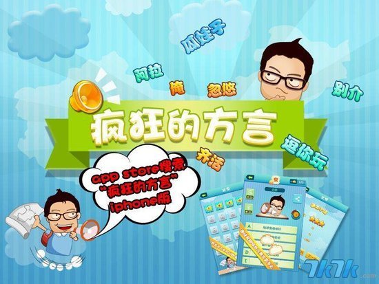 小编告诉你,这个必须有,让我们来重温一下乡音,让我们听一下中国各个地方的语言,让我们一起来把这宝贵的历史文化传承下去吧!由7K7K指趣开发的《疯狂的方言》让说方言成为一种时尚,一种潮流。目前该游戏的安卓平台下载已超百万,IOS平台上也表现不俗。在游戏中,玩家要做的事情很简单,就是聆听全国各地的方言并猜出题目中的话是什么意思即可过关。为了让玩家更容易接受游戏的设定,开发团队用尽浑身解数将游戏的趣味性提升到更高的层次,让我们一起来看看这些疯狂的游戏设定。