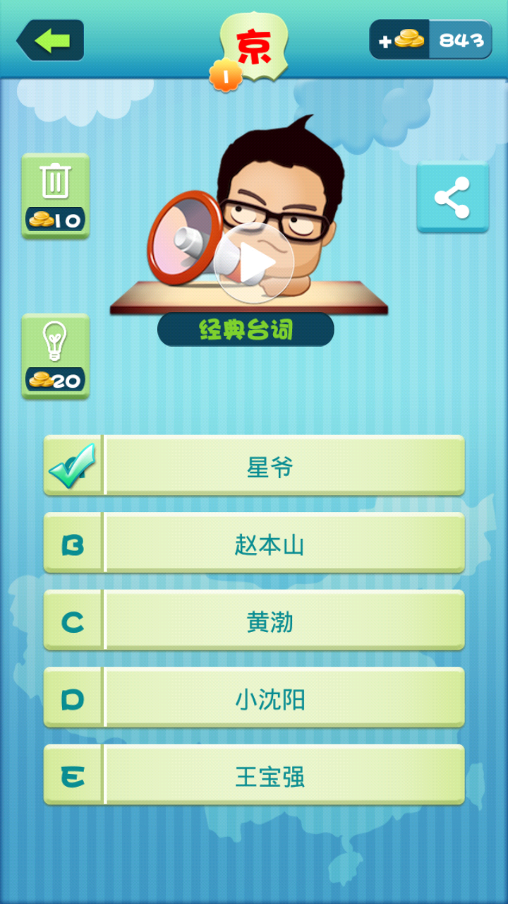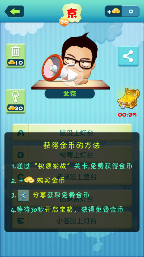 关卡里面有很多的道具,可以使用的有“提示信息”,“去掉一个错误答案”,”分享”,”免费宝箱”等等。有的可以帮助玩家解开迷思,有的可以帮助玩家降低游戏难度,有的可以直接让玩家获得奖励,有的可以让玩家的成绩得到炫耀。总之,道具多多,欢乐多多。