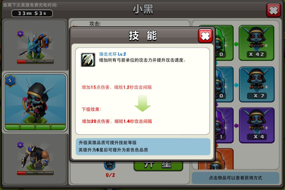 小黑会优先攻击范围内最近建筑、遭受英雄伤害时优先攻击英雄。作为远程输出,小黑的输出环境比许多近战英雄更有优势,在己方肉盾的保护下,可以持续提供大量输出;而其强击光环为弓箭单位增加伤害和缩短攻击间隔,可以使以弓箭手为主的阵容更具摧毁力,在小黑的带领下可以迅速击杀敌方英雄并清理防御建筑。