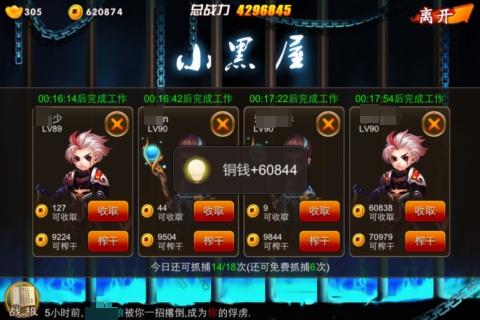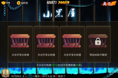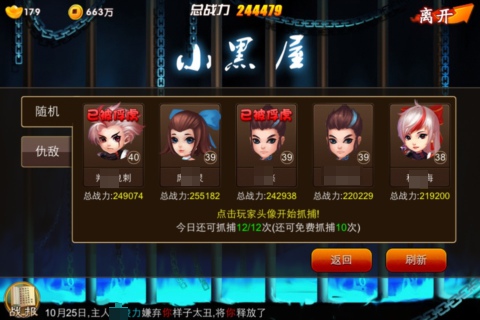 小黑屋在玩家23级通关王府庭院2后开启,获得两个放置被抓捕奴隶的牢笼,就可以抓捕不高于或低于自身5级的玩家,还可以从别人手上抢奴隶,因此,《囧西游》世界频道最常见的几句话就是——“我靠,又被抓了!”“奴隶又被抢了!”被抓捕和被抢奴隶的玩家接二连三上世界频道吐槽咆哮,然后随之而来的,就是不间断地抓捕与反抓捕。虽说被抓了很烦恼,但是《囧西游》打破传统手机网游“类单机”的缺陷,给玩家们带来不亚于PC端游戏的交互乐趣,所以“小黑屋”玩法当仁不让地收获了最高人气!