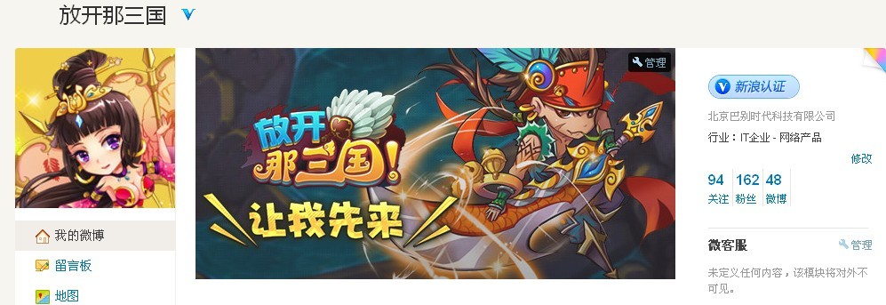 言归正传,大家不要在寂寞了!在《放开那三国》调试阶段,各位玩家可以每天关注微博(没有“围脖”的用户不要紧,你们可以去商店里面买一个哦!)、微信(微信这个东东你要是没有,小三真的木有办法了!o.0)每天都有精彩连篇的笑话,如果你也有好玩的笑话,也可以发送到官网微博、微信,内测后还有机会获得幸运大奖呦!。