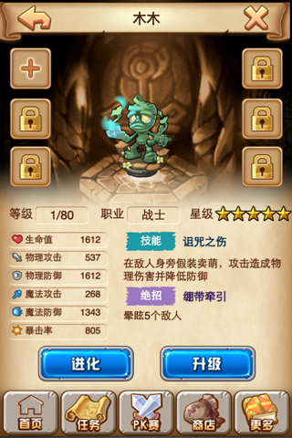孤独、可爱的悲情男主角当属木木了!独自从古老,被遗忘的历史中醒来,渴望友情的他一直孤单的闯荡在世界的各个角落。当遇到危险时,擅长使用绷带的他能准确的捕获敌人,并使敌方全部晕眩。当木木愤怒后,“诅咒之伤”会摧残所有挡在他面前的生物。