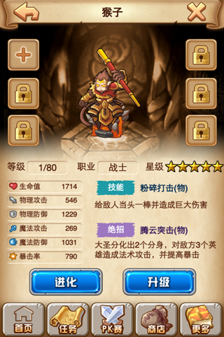他是通过神圣的符文之石而创造,体内蕴藏着强大力量的神猴。自诞生起,就追寻着不凡与伟大。不可一世的猴子能挥舞金箍棒粉碎面前的敌人。在面对激进的攻击时,狡猾的他使用真假分身迷惑敌人。自负而骄傲的他,无所不能,常让敌人望风而逃。