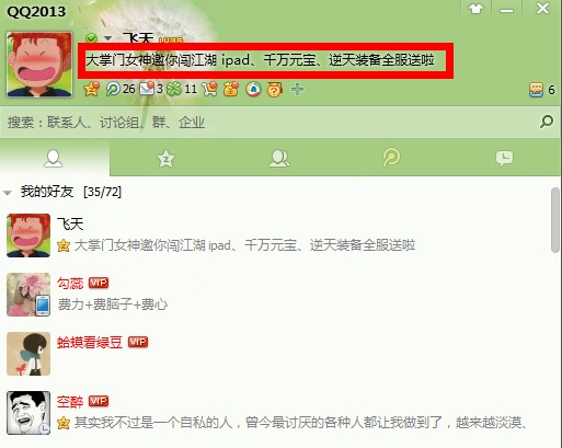 玩家更改QQ个性签名为“大掌门女神邀你闯江湖 ipad、千万元宝、逆天装备全服送啦”,并截图;进入玩蟹科技《大掌门》官网论坛,在光棍节活动贴下回复截图即可,回复格式同上。