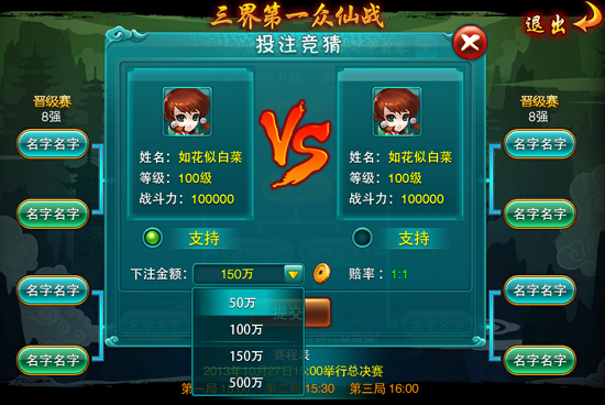 众仙会不止属于强者,它是一场古罗马竞技似的全民狂欢。每场比赛,玩家均可投注一个对阵,若投注的目标玩家获得比赛成功,投注者可以获得投注铜钱的双倍返还~